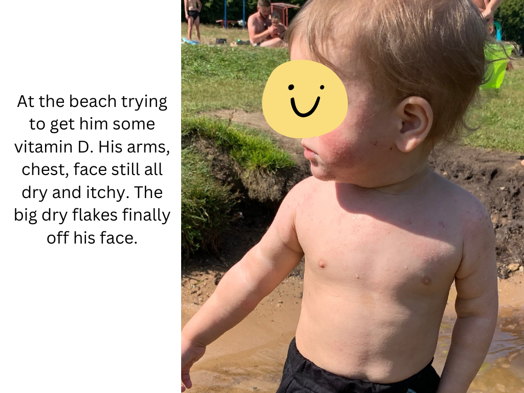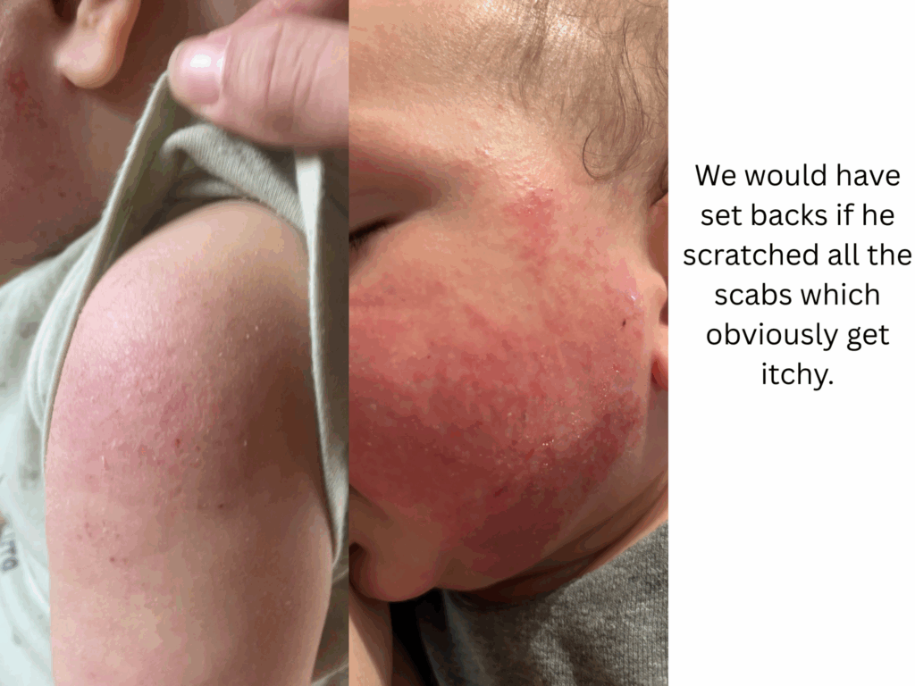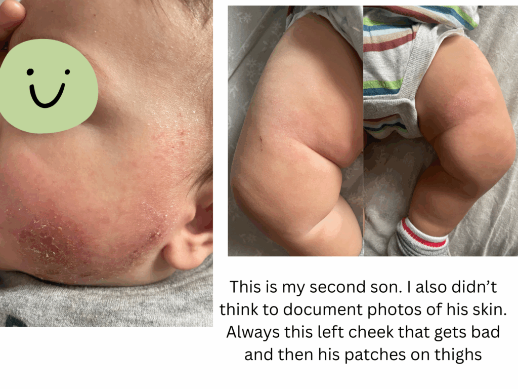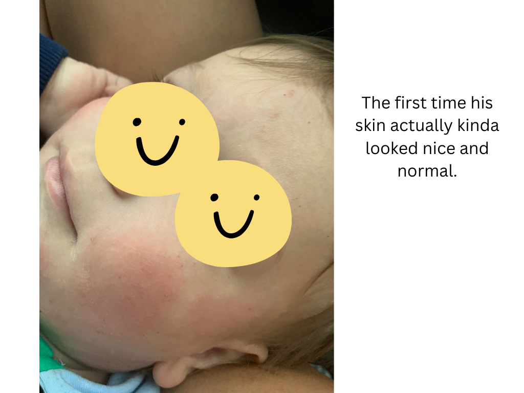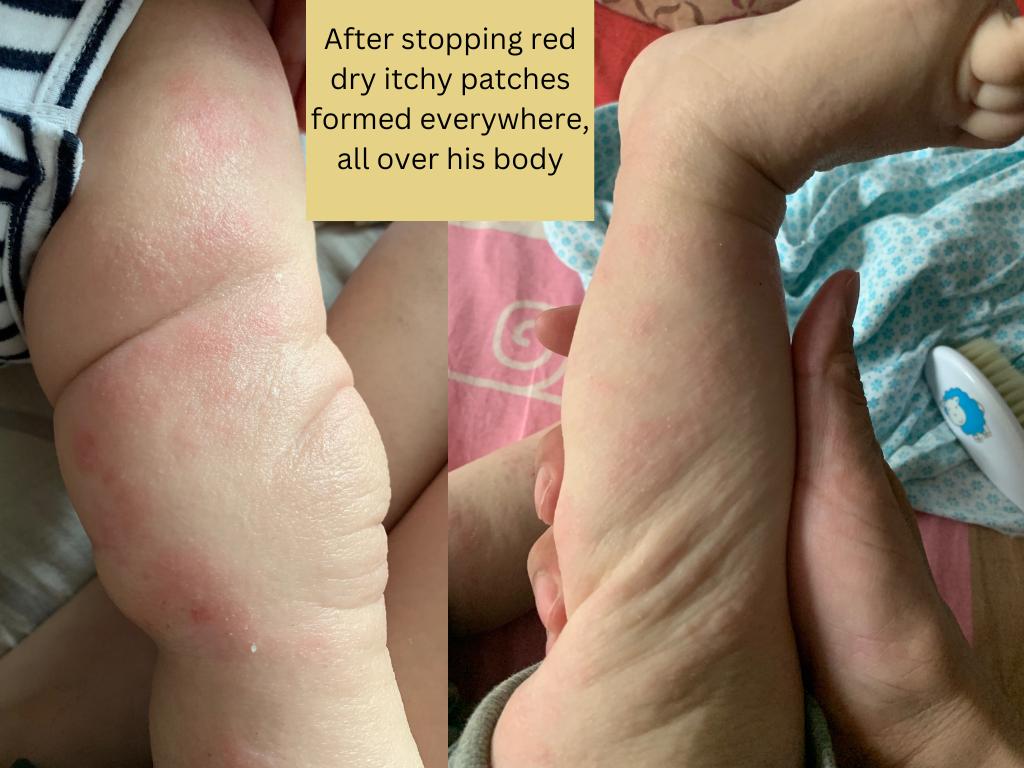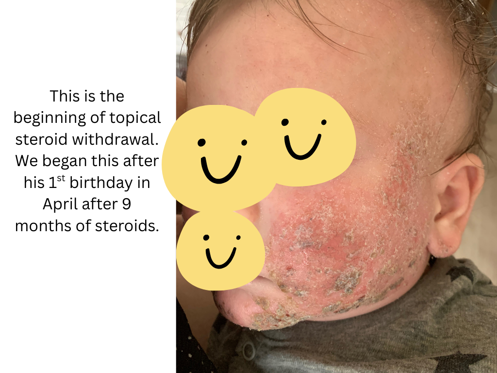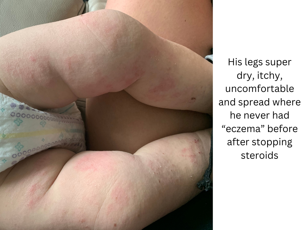 I am writing this almost 7 years later his since my first sons eczema began. My first son got eczema at 3 months old. This happened after we got him his first routine check up (jab) as first time parents we just went with the flow (we never got anymore after that). Just a little patch on his cheek but as a first time mother I was concerned and got him checked. They prescribed steroid creams and said he has eczema and you know how it goes from there. The eczema went away but then it came back. I used the cream again and it worked until the eczema came back. Then it seemed that cream didn’t work anymore so wanted to try something else. Nurses told me to stop breastfeeding because my baby is allergic to my milk. I was heartbroken and I tried for that day. We bought formula that was allergy free or whatever and my son wouldn’t take it. He cried for 4 hours without eating it and I cried with him. Then I just let him eat from me. I was determined to figure out what is going on in his body and mine. The doctors said it was genetic somewhere in our families. I never saw eczema growing up in my family (I never had it and nor did my husband). I needed to know what we’re dealing with. I started reading everything I could about eczema. I avoided all eczema trigger foods and reached out to some youtubers who healed their eczema through diet but they didn’t want to work with a baby basically. So I just avoided milk/dairy products, citrus, peanuts, nuts, seed oils, tomatoes (just search up eczema trigger foods and it’ll all come up) I can’t remember now it’s been a while. Eventually it came down to me only eating boiled beef and potatoes, broccoli (and cut it out too) with extra virgin olive oil with salt and still drank coffee. I excluded all allergens and zero perfume products like laundry detergent (zero perfume) for sensitive skin, my personal products had zero perfumes, I stopped wearing perfume and my husband also. We only used 100% cotton clothing for him and our blankets and pillows (no fleece). We didn’t have much carpet in our house so I think that was ok if it could be a trigger). My dish soap was for sensitive skin. I got a air purifier for our room to try eliminate any dust that could be flaring him up. Even now I was reading ingredients in cream and trying to make sure there was no parabens or any allergy inducing ingredients. There was just so many variables I had no idea what it was. On top of all of this, I was trying different creams on top of the steroid creams as well. I tried the oatmeal baths but never saw any improvements. I did bleach baths but still nothing really. Also one thing I kept doing was trying too many things and not waiting enough to see what actually worked. There was too many variables again with diet, creams, baths, outside triggers, etc. because then when something worked (his skin seemed ok) I wouldn’t know what exactly helped it and only attributed it to the cream for example and when I would try the cream again, it didn’t help as much. I was on etsy searching up eczema creams and even got a lady to formulate a special cream with herbs to help with eczema and nothing ever really worked. And not to mention that during this whole time, we barely slept because baby was itchy or waking all the time. I let him soothe on me majority of the time because it was the only thing to help. I put socks on his hands so he wouldn’t scratch. I was so upset when family members would want to hold him and were wearing perfume and hug him up and it would be all over him (I didn’t have the courage to say no sorry you’re wearing perfume and it’ll upset his skin). My husband and I watched him like a hawk to make sure he didn’t scratch. He could never be left alone just playing because he would have an itch attack. We would work so hard to heal up his skin and then one scratch got it all bloody and back to square one. Family members would hold him and not know or understand that you have to watch him so he doesn’t scratch and of course, he would get a scratch in and I would be so pissed because I’m the one dealing with his recovery. I was reading one of the prescribed steroid creams I had and it said only use for 2-4 weeks and nothing more. I read more about the steroids and dependency it creates and knew deep down this is not something I wanted for my son to be dependent his whole life. I knew we had to stop. I started reading about topical steroid withdrawal (TSW) and oh my the horrors of it. I read a story will try to find the link again of a mother and her son who had eczema (all of our same story just a patch and then onto the next cream and next cream) and it got to the point they injected steroids into him. He was only like 6 months old and he got this injection and his whole body reacted and was inflamed. It was so heartbreaking. He was in really bad shape and she stopped the steroids too and he went through TSW. His case was 10x worse than my son’s so it inspired me if these guys can get through it then we can too. She had an etsy page eventually because she formulated her own cream to help her son which I ordered from her too. If I remember it took over a year for his skin to start being normal again. So I accepted this time frame that we’re gonna go through this for at least a year, whatever this was. It was his one year birthday coming up and I said after his birthday we will stop (because I just wanted him to have nice skin for his first birthday). So for 9 months we used the steroid cream and after his first birthday, we stopped and went cold turkey. Was it the right thing to do? I don’t know. Should I have tapered off? I don’t know because I don’t even know what that looks like with a steroid because his body needed it everyday. We went cold turkey. I said we’re not using these again. His skin turned red and inflamed all over his face and his body. He cried he was so uncomfortable. I just soothed him, hugged him, held him and