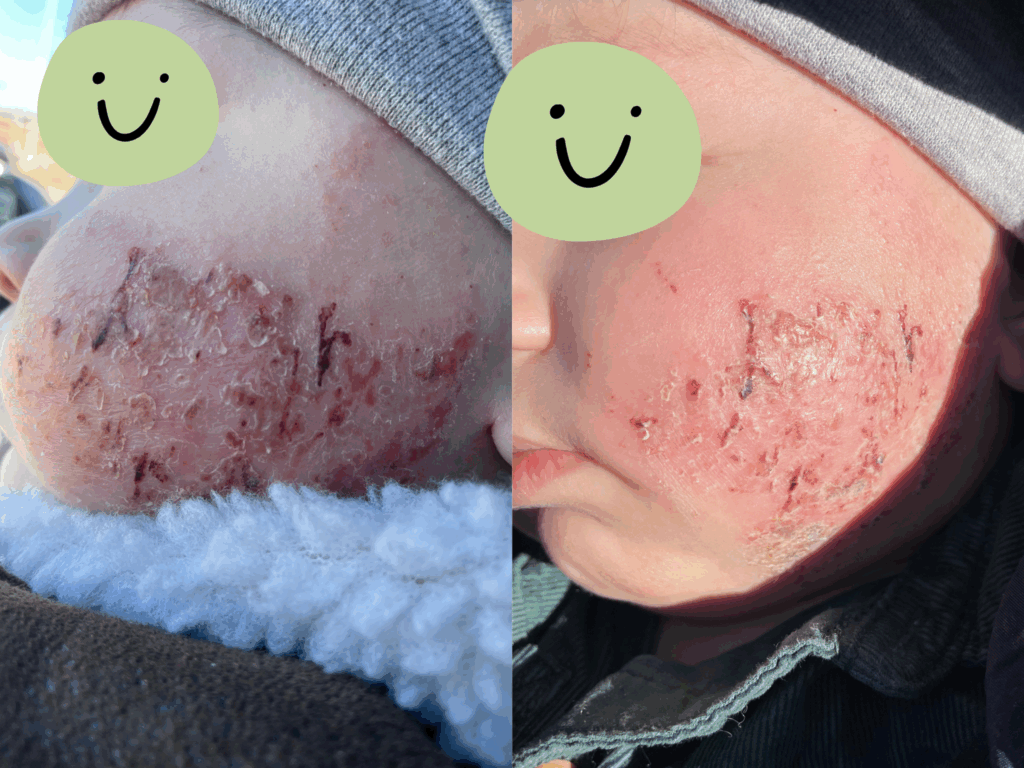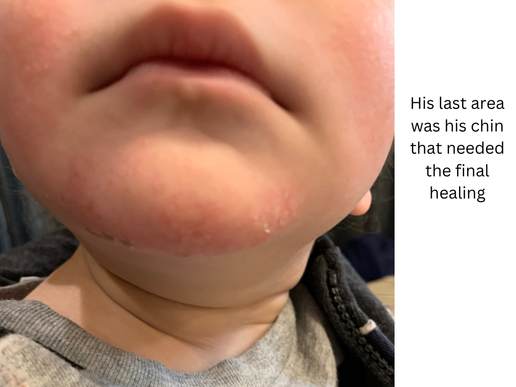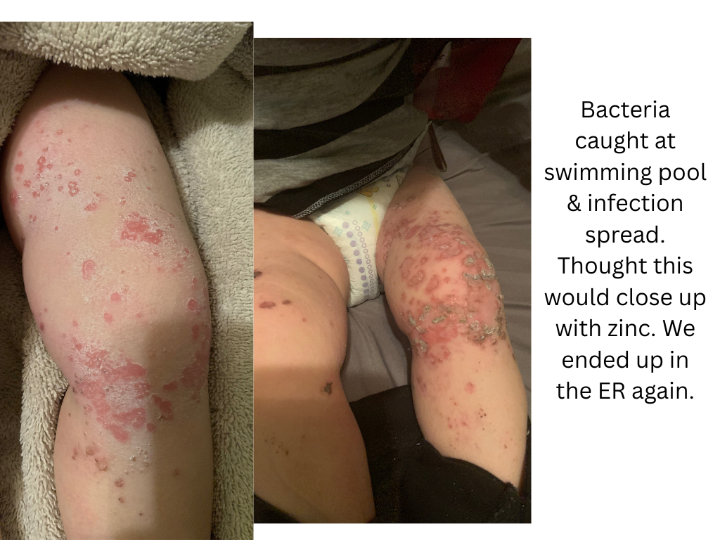 I also read about carnivore diet and saw peoples testimonials about going carnivore and their eczema went away or improved. So for 30 days, I can proudly say, I did strict carnivore. I ate only beef and salt and eventually pork. I needed more fat and was going crazy and once I ate the pork fat my whole body felt better. This was a whole journey itself. I cried a couple times because it was hard and I wanted to eat other food. We stopped the steroids middle of April and I began carnivore beginning of May until the end of May. It felt like there was some improvement with his skin a little. I ended up adding rice and potatoes back into my diet. I drank coffee with coconut milk as a creamer. I cut out sugars besides the carbs. I also did this for my son (like no more sweet purees which has lots of sugars like apple puree). Nights were horrible. It took him forever to sleep he was just so uncomfortable. My husband and I would be rocking him and back and forth in our arms. If he cried at night I just gave him the tit to eat/soothe because I was so tired too. The actual bed time routine to get him to sleep took forever though. I even forget these moments now. During all this time, I’m still reading and trying to find ways to help. Later I was deep in some forums and saw something somewhere a grandmother took her grand babies to the sea and their eczema was gone. So I’m open to anything. I bought some sea salt for baths and it had magnesium in it. I put like a cup into the bath and mixed it up. I bathed him in this mixture and washed his face (his face was the worst part, always open and sore, oozing or not, dry and flakey – all in between) and he would cry when I washed it and all the flakes off but after we got out – his skin looked together and better for once. And for the first time, while I was changing him he fell asleep (like without needing the boob or rocking or holding). I was scared and not sure what’s going on it’s not even nap time but as I understood it was the salts/minerals/magnesium his body absorbing and relaxed him (for once) and he just napped). Again, I didn’t put all of this together at the time and if I could do it all again, all we would do are salt/magnesium baths. Because also, doctors would say don’t do too many baths because it dries out the skin or whatever nonsense. You gotta do what is working. No doctor told me about the salt/magnesium bath or that zinc helps restore the skin because they aren’t trained to know this kind of stuff or never been through it. We still had a rough time sleeping because of the itch attacks. I was reading that because the body is calming down to sleep then for whatever crazy reason the itch comes. I still put socks on his hands for sleep and believe it or not, I still swaddled him after 1 years old (I had to use 2 blankets to keep him stuck in there so he wouldn’t break free to scratch). Eventually in the morning he would break free but it helped with the first few hours into the night. On top of all of this, I barely went out because I was self-conscious about us and his skin. I didn’t like people looking at him or making any comments. I was reading about gut bacteria and that people with eczema have basically like a leaky gut. So I gave some baby probiotic drops plus vitamin d3. In the end of September, I tried some cheese and was worried too but tried some and it didn’t seem to affect my breastmilk. So the next day I gave him the smallest like the size of a pinky nail even smaller piece of cheese. One hour later his whole body was red in hives and itchy. We went to the ER and they gave him an epinephrine shot. He ended up puking and had diarrhea everything in his body. We got a referral to an allergist and he was severely allergic to cows milk a1/a2 and goats milk (which I stayed away from because of eczema triggers from before). I say all this normally right now but it was a stressful time looking back. He was still going through TSW and had elephant wrinkly dry skin on his legs and body. One thing forgot to mention, when we stopped cold turkey (his trouble area was always his face) his “eczema” and itchiness spread everywhere else. It was all over his body, arms, chest, back, legs and face. I was trying no moisture therapy for a while but kept caving into trying a natural cream because his skin was just sooo dry and flakey. I even bought a hand vacuum to suck up all his skin flakes every day. I tried all the name brand creams and went to try another avene oatmeal one. I remember this one because we took our bath and after I applied the oatmeal cream on him and he just screamed! I had to throw him back into the tub to wash it all off. It was awful. So in between this time I was still trying to test out different creams without steroids to moisturize him. I was using tallow as well but it was just ok. I ordered so many things off etsy to try. I was desperate. I was using just coconut oil but it didn’t really help. I still had to watch him like a hawk for his scratching. I had saline solution still to clean up all the scratches/blood and use the zinc cream to repair it. In October we went swimming at a public pool because you know chlorine water should be good for their skin or could help clean it. It was my fault because we went with family and kids and I let him in the water a little and we didn’t wash after the pool (big mistake). His skin was already weak and vulnerable that a couple days later he developed some skin eating disease (I don’t even know what to call it) on his legs. It was one open wound and I cleaned it and used the zinc but the zinc wouldn’t really cover over. Then it kept spreading and got bigger. We went to emergency again and they wrapped it up with almost half of this antibiotic cream just used it maximum, wrapped it and taped it up. They gave prescription for oral antibiotic (deep down I still knew that antibiotic orally will mess up his gut even more and kill all good and ba