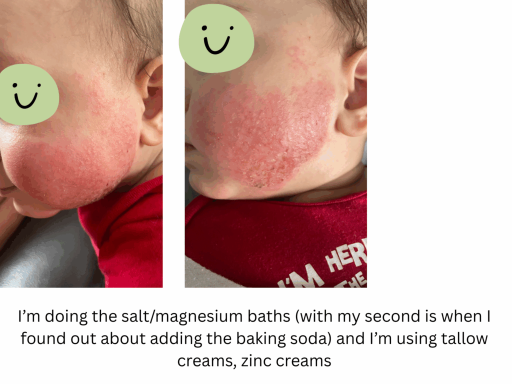 Now we had our second son and no routine checkups/jabs either (my first would be 5 years old now and eczema free just sometimes some outside allergens that would make him itchy and we would have to give him an antihistamine – plus did allergy testing that he’s allergic to dairy, peanuts, nuts, sesame seeds, seeds, potatoes, gluten, flour) and at 3 months he started developing eczema. I thought ok I know how to handle this, I’ve been here before, it’s not my first rodeo. So I did the same bathing routines and got some creams. I found this cream again from this mother who went through TSW on etsy again. I started making my own creams with tallow and formulating herbs into it. I got saline spray again to clean skin. I had zinc creams ready. It was only on his face.