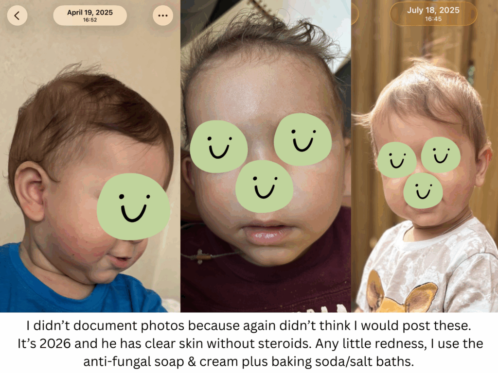 On top of all of this, I was giving vitamin D3+k2 drops, cell salts 12 in 1, zinc and cod liver oil and if possible get them to start eating liver. It’s loaded with vitamins the body can absorb. And now my oldest son doesn’t have any crazy eczema patches, redness or problem areas. There are some minor itches he gets but probably from food since we’re exposing him to more foods. As of 2026, we take salt/baking soda baths (add magnesium from time to time) and wash them with anti-fungal soap and currently using the ringworm cream in green packaging.